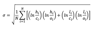 Garman and Klass นั้นต้องการจะลบจุดด้อยของ Parkinson โดยการนำราคาปิดระหว่างวันเข้ามาคำนวณรวมกับ Range ระหว่างราคา High และ Low ด้วย ซึ่งวิธีนี้จะสะท้อนทั้ง Intrday Moves และราคาปิดระหว่างวัน โดย Garman-Klass Volatility นั้น สามารถคำนวณได้ตาม Formula ดังนี้